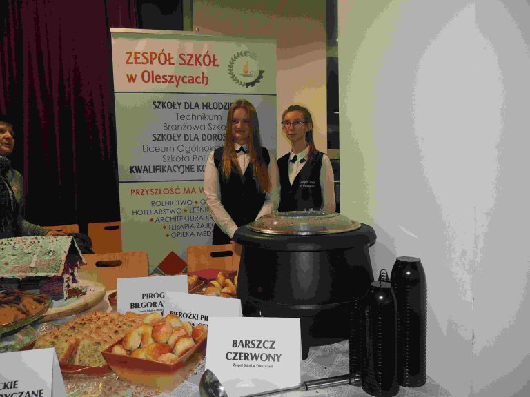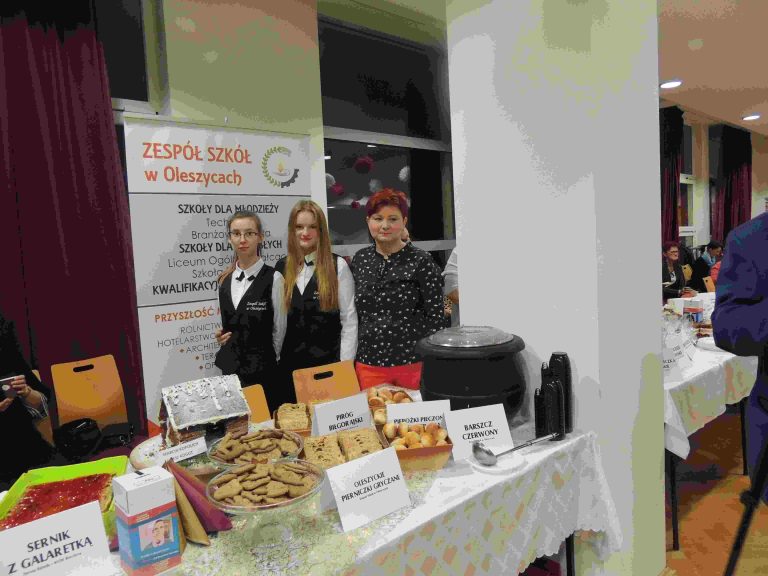 W dniu 15 grudnia 2018 r. uczniowie naszej szkoły wzięli udział w akcji charytatywnej „Smaki, które łączą”, która odbyła się w MGOK w Oleszycach. Pani Agnieszka Nieckarz wraz z Wiktorią i Karoliną przygotowały prelekcję dotyczącą sztuki nakrywania do stołu. Zostało przygotowane stoisko kulinarne z tradycyjnymi potrawami wigilijnymi naszego regionu. Wszystkie potrawy oraz słodkie pierniczki przygotowała młodzież klas gastronomicznych. Środki zebrane podczas imprezy zostaną przekazane na rehabilitację Bogdana Kuźmika i Mateusza Zająca.
