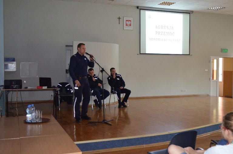 W dniu 30 maja 2019 r. w związku z tragicznym zdarzeniem, które miało miejsce w jednej z warszawskich szkół w ramach działań wychowawczych i profilaktycznych, eliminujących zagrożenia i wzmacniających pożądane zachowania, mające na celu zapewnienie uczniom bezpieczeństwo fizyczne i psychiczne odbyło się spotkanie młodzieży, nauczycieli i rodziców z przedstawicielami Komendy Powiatowej Policji w Lubaczowie na temat „Zagrożeń i czynników warunkujących bezpieczeństwo w szkole, oraz procedur zachowania w sytuacjach nadzwyczajnych i obowiązków wynikających z poszanowania drugiego człowieka”. Podczas spotkania policjanci przedstawili aspekty odpowiedzialności prawnej nieletnich za popełnione czyny karalne, wyjaśnili pojęcie czynu karalnego, demoralizacji, jej przejawów oraz kiedy za swoje czyny odpowiada się jako nieletni, a kiedy już jako dorosły. Przypomnieli jak należy się zachować w momencie stania się świadkiem bądź ofiarą napaści nie tylko w szkole. Policjant na zakończenie spotkania zaznaczył że każdy kto posiada informację o zachowaniach ryzykownych jest zobowiązany do poinformowania o tym rodziców, nauczycieli lub odpowiednich służb mundurowych.
