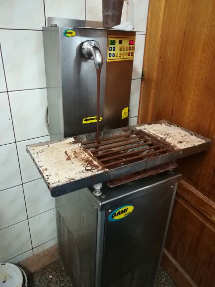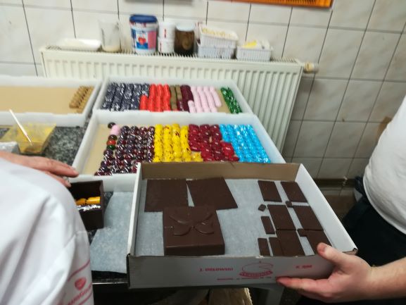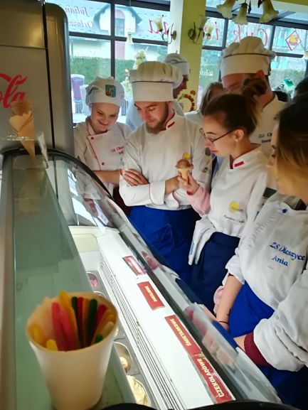 W cukierni, dzięki uprzejmości pana Raka mogliśmy poznać park maszynowy, układ funkcjonalny oraz zapoznaliśmy się z szerokim asortymentem wypieków. Właściciel cukierni pokazał nam, w jaki sposób wykonuje się dekoracje z czekolady plastycznej oraz temperuje czekoladę. Obejrzeliśmy katalogi ze wspaniałymi słodkościami wykonanymi w zwiedzanym zakładzie cukierniczym. Spróbowaliśmy pysznego ciasta drożdżowego z jagodami oraz lodów sporządzonych wyłącznie z naturalnych składników. Nasi uczniowie mogli również sprawdzić się w dekoracji cukierniczej. Tort, udekorowany przez uczniów klasy III, pan Kazimierz Rak podarował naszej pani dyrektor.
