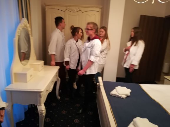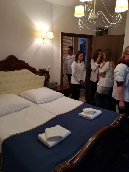 W obiekcie hotelowym mieliśmy okazję poznać układ pomieszczeń na kuchni oraz organizację pracy kucharzy. Obejrzeliśmy sale: kameralną mogącą pomieścić do 130 osób, balową dla 300 osób oraz konferencyjną. Pokazano nam również część hotelową i wybrane pokoje oraz apartamenty znajdujące się w ofercie obiektu.